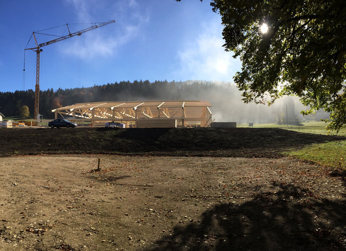 Premier coup de pioche, le 30 juin 2015. L’entreprise Carlin, a effectué tous les travaux de terrassement, la construction du mur en gabion, les drainages et les aménagements extérieurs. L’entreprise Bianchi a réalisé tous les travaux de maçonnerie, et de fondation. Ensuite c’est JPF Ducret charpente bois qui s’est mis à l’œuvre, avec le montage de la charpente et du bâtiment. Il y a eu aussi de nombreux amis qui ont mis la main à la visseuse et au marteau pour le montage des écuries, boxes, par-bottes, paroi, plancher, sanitaires, etc…